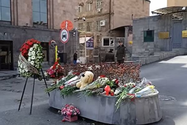 Ծաղիկներ, խաղալիքներ եւ մոմեր ՀՀ-ում ՌԴ դեսպանատան մոտ՝ Կրոկուսի ահաբեկչության զոհերի հիշատակին